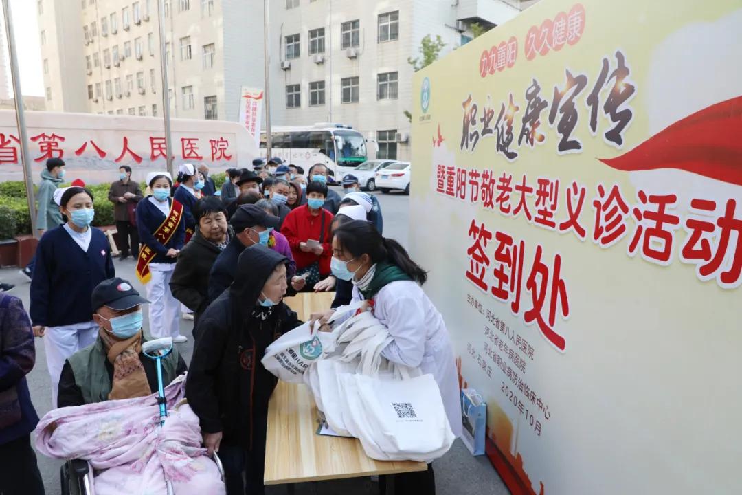九九重阳,久久健康。10月24日,2020年重阳节前夕,河北省第八人民医院(河北省老年病医院、河北省职业病防治临床中心)在院内举行职业健康宣传暨重阳节敬老大型义诊活动,由京冀知名专家组成的专家义诊团为社区老人和广大劳动者进行义诊服务,讲解老龄健康和职业病防治知识,以实际行动传递温暖与健康。