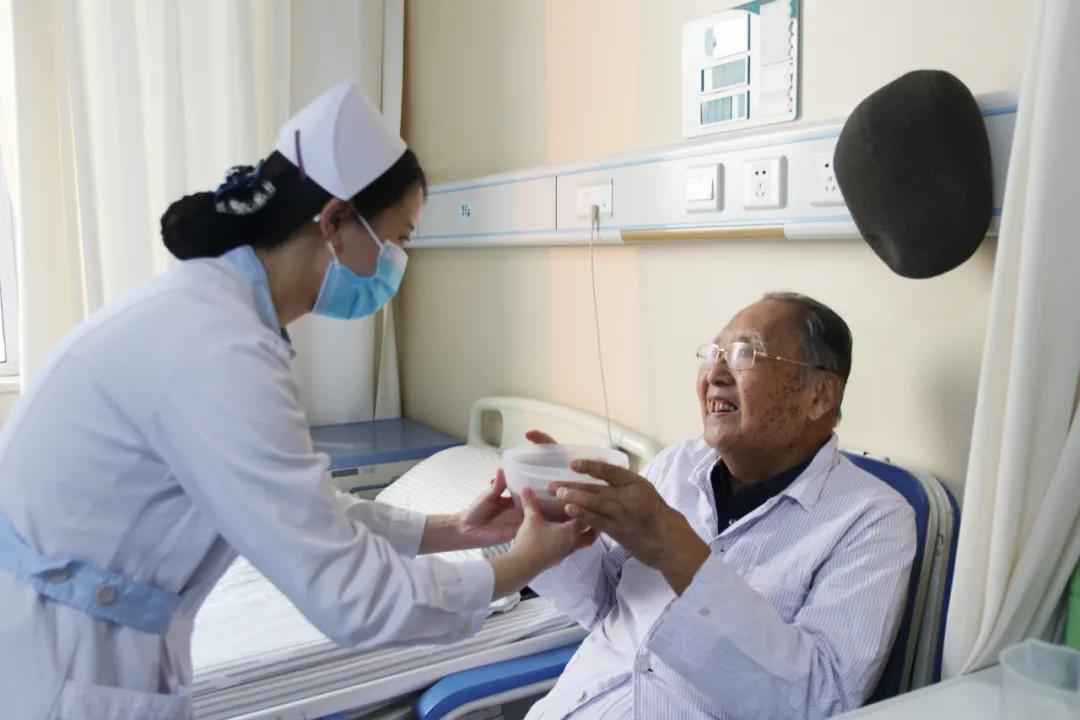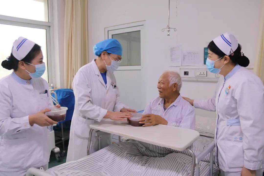 中西医结合科主任孙立新为“无陪护”患者送上“爱心八宝粥”,祝福老人早日康复