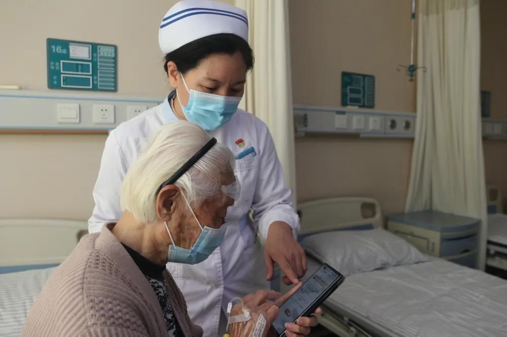 护理人员指导老人答题抢红包