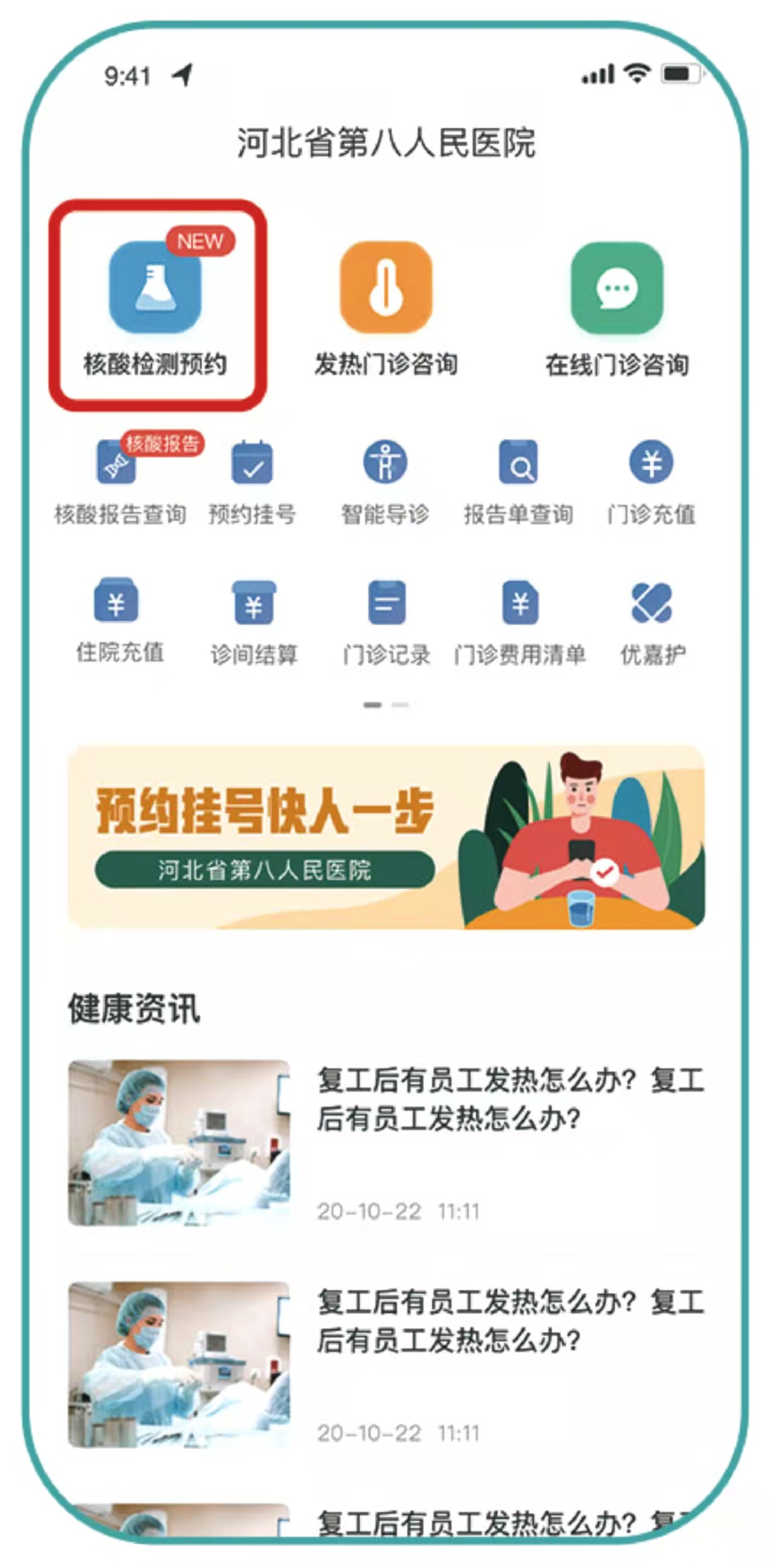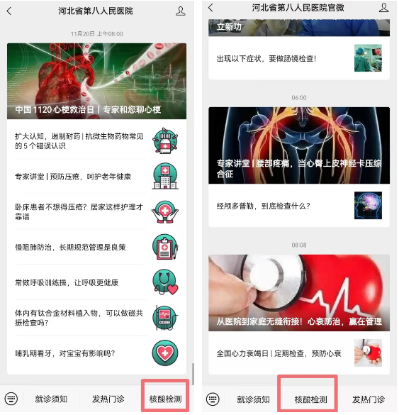 1.微信关注河北省第八人民医院公众号(或小程序搜索河北省第八人民医院官方),选择“核酸检测”↓↓↓