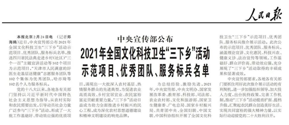 日前,中央宣传部公布2021年全国文化科技卫生“三下乡”活动示范项目、优秀团队、服务标兵名单,河北省第八人民医院老年友善志愿者医疗服务队获评“2021年全国文化科技卫生‘三下乡’活动优秀团队”。
