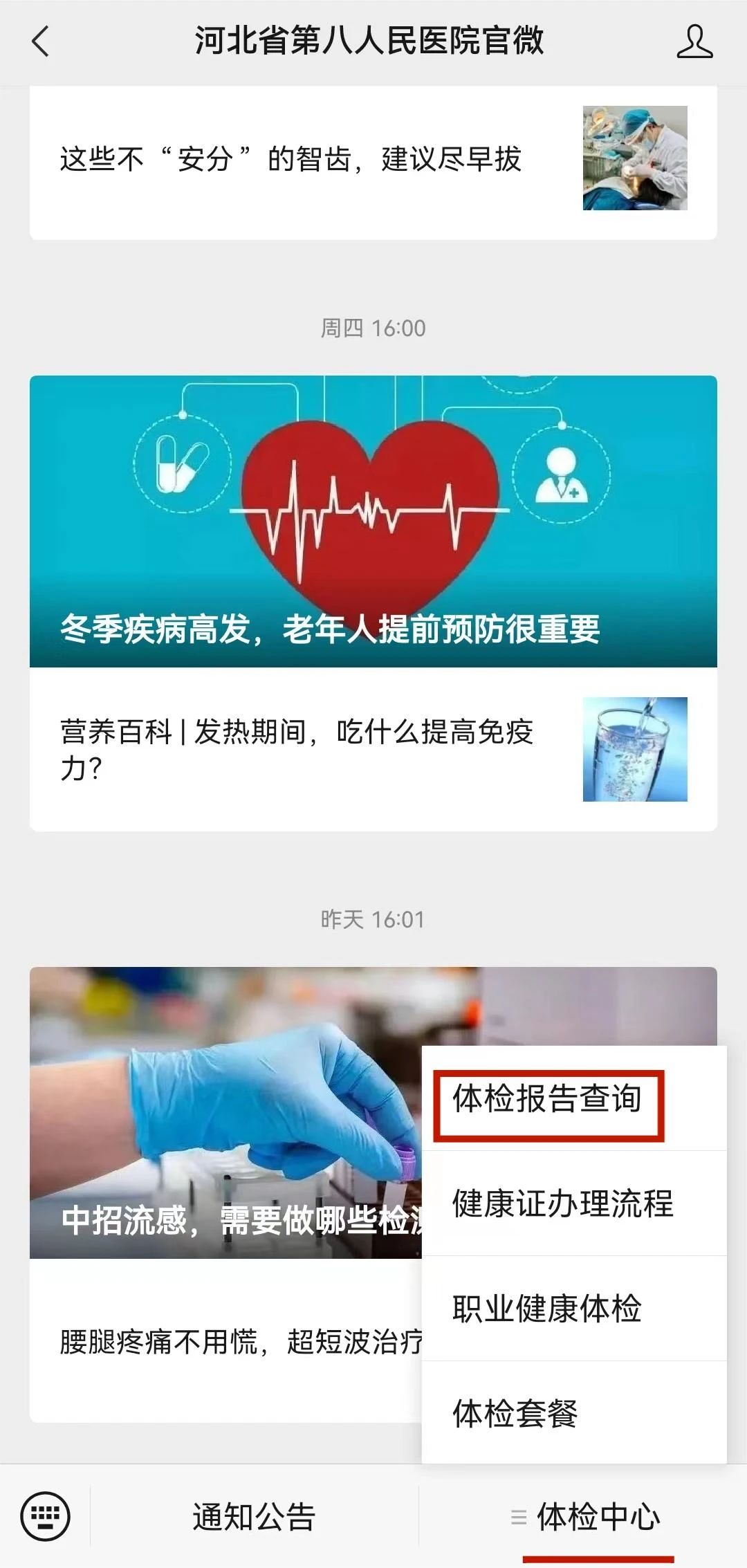 1.关注“河北省第八人民医院官微”,体检完成收到短信提示后,可在公众号读取电子报告。